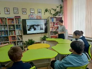 Ребятам была представлена литературная галерея "Это память листает страницы" в рамках 80-летия произведений известных авторов В. Катаева "Сын полка", А.Твардовского "Василий Теркин", Е.Ильиной "Четвертая высота".
